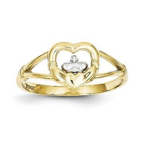 This ring is a 10K and Rhodium Ladies Claddagh Ring and weighs 1.2 grams.