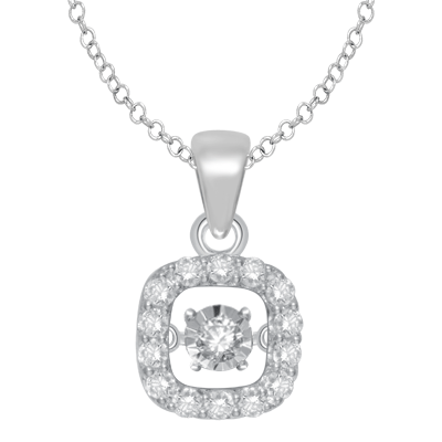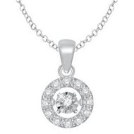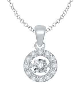 The center diamond is set into a small bezel that hugs the edge of the diamond. The bezeled diamond is then securely placed into the middle of the pendant using a new and innovated design allowing the diamond to continuously move with the slightest of movements such as breathing, heartbeat, or even the vibrations from the room you are standing in creating The Dancing Diamonds.