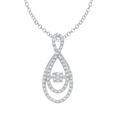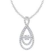 The center diamond is set into a small bezel that hugs the edge of the diamond. The bezeled diamond is then securely placed into the middle of the pendant using a new and innovated design allowing the diamond to continuously move with the slightest of movements such as breathing, heartbeat, or even the vibrations from the room you are standing in creating The Dancing Diamonds.