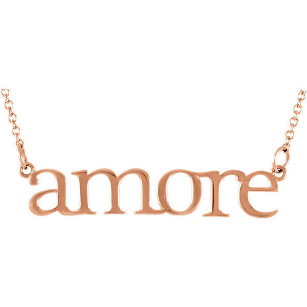 This "Amore" necklace is available in 14K Yellow Gold, 14K White Gold or 14K Rose Gold. The Pendant weighs approximately 2.19 grams. This item is