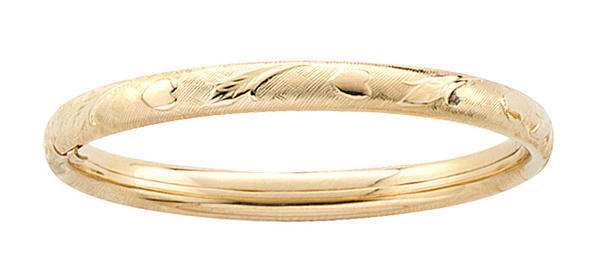 *14K Gold Filled Children's Bracelet *Fits Children ages 3-10 years old. *This item is solid 14K Gold Filled and comes with a manufacturers Lifetime Guarantee. *Ships in 1-2 Business Days *Superior Quality *Hand Engraved Embossed Finish *Bracelet has a secure and strong guard and hinge lock. *Bracelet has beautiful "Heart and Leaf" pattern throughout the bracelet. Perfect for Birthdays, Religious Events, or any occasion.