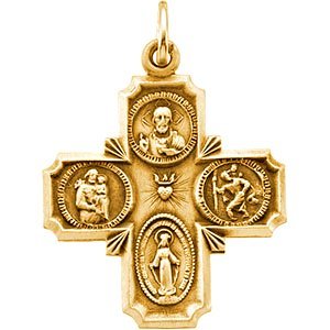 The 4 way cross features The Sacred Heart if Jesus at the top, Miraculous Medal front at the bottom, Saint Joseph to the left, and Saint Christopher at the right. With Mary's heart in the middle. THIS MEDAL IS ONE SIDED ONLY!