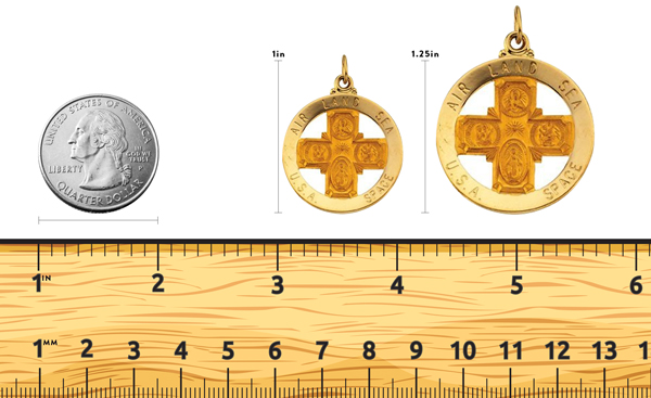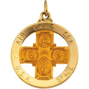 This 14K Solid Gold Four Way Medal is really four medals in one. The back has a scapular medal with Our Lady of Mount Carmel.Sacred Heart on the top Saint Christopher on the right, Miraculous on the bottom and Saint Joseph on the left. The words Please call a priest are inscribed on the back to alert emergency staff of The persons wish for the last Sacraments. This medal also has the words Air, Land, Sea, U.S.A and Space inscribed on it.