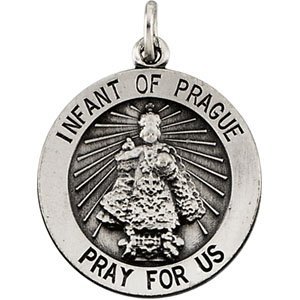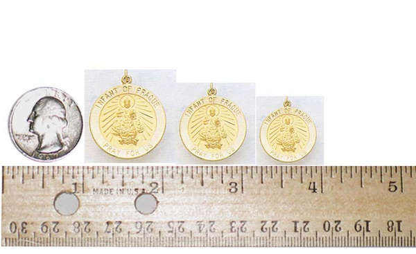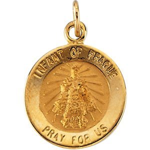 This 14K Solid Gold Infant of Prague Medal Depicts the statue of the Christ Child King. The Infant Jesus told one of his subjects "occupy yourself with my interests, and I will occupy myself with yours"