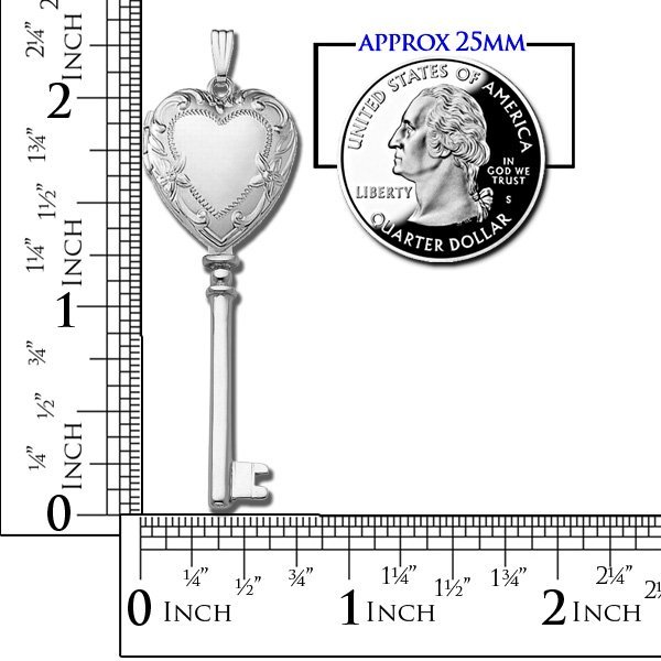 Literally giver her the "Key to your Heart" This photo locket is perfect for a Mother's Day gift, Anniversary gift, Birthday gift or any occasion. Solid 14K White Gold Heart Locket can be engraved with a special messages for your loved one to make this locket an even more beautiful gift. Heart Measures at 3/4" x 3/4" (3/4" x 2" All Together") Size does not include Bail or Loop. CHAIN SOLD SEPARATELY. Ships in 1-2 Business Days. This is the perfect Valentine's Day or Wedding Locket.