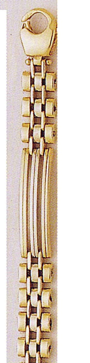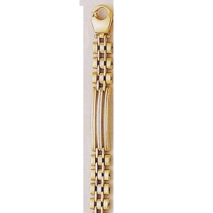 This very handsome bracelet has a stylish yellow gold panther link desigh with a triple white gold bar. The durable lobster claw clasp ensures saftey.