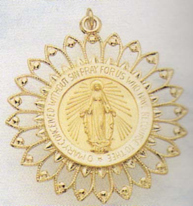 "I've purchased two Miraculous Medals from you at different times. Both times I've been highly satisfied. They came when expected and there were no hidden costs. Actually look so much better than pictures on site. No photo does jewelry any justice. The recent one I got was in sterling silver. I bought it for a friend for Mothers Day as she keeps admiring the one I always wear. Won't she be surprised. Thank you for your meticulous work in creating this fine jewelry."