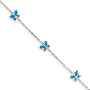 14k White Gold Polished Blue Enameled Butterflies Anklet