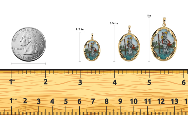 This Saint Christopher Medal is Hand Painted Porcelain that is then fired and set in a 14K Solid Gold frame.