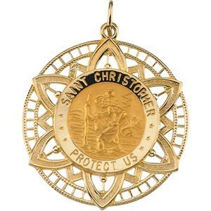 This unique Solid 14K Gold Saint Christopher medal has a fancy bearder around a round medal. Saint Christopher is the most popular medal to be worn by travelers. This medal is yellow gold and has a high polish finish.
