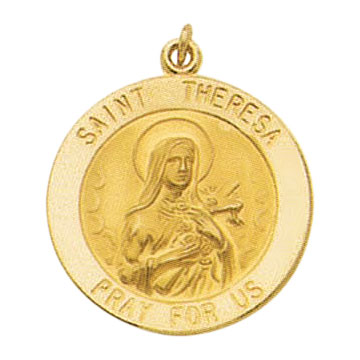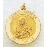 Saint Theresa is the "Little Flower" The Saint for Florists, Aviators, Foreign Missionaries (October 1). This medal is all 14K Solid Yellow Gold.