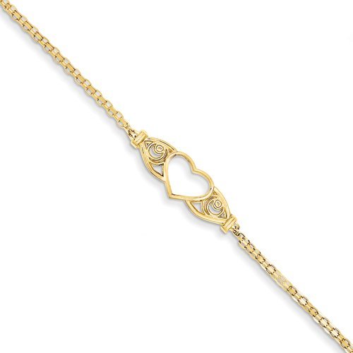 14k Polished Antiqued Heart Anklet