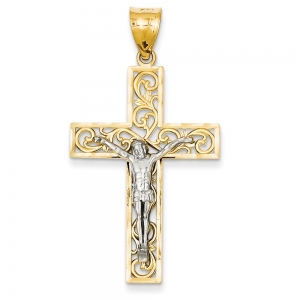 14K Two-tone D/C Large Block Filigree Cross w/Crucifix Pendant