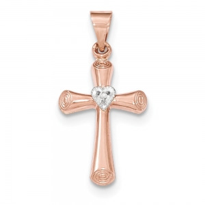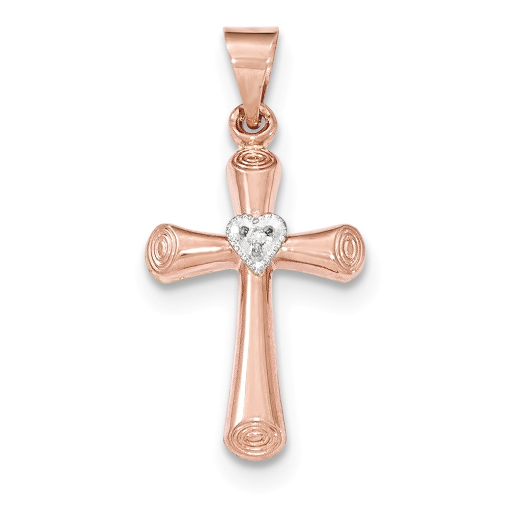 14K Two-tone Diamond Brushed & Polished Hollow Latin Heart Cross Pendant