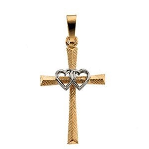 14K TWO TONE GOLD CROSS PENDANT W/DOUBLE HEARTS