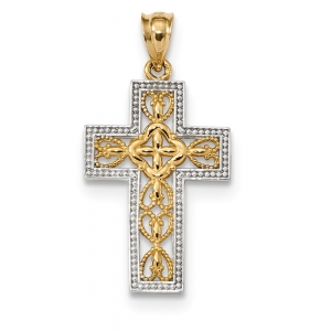 14k w/White Rhodium Polished Filigree Cross Pendant