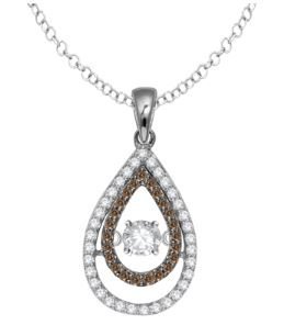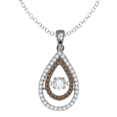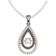 The center diamond is set into a small bezel that hugs the edge of the diamond. The bezeled diamond is then securely placed into the middle of the pendant using a new and innovated design allowing the diamond to continuously move with the slightest of movements such as breathing, heartbeat, or even the vibrations from the room you are standing in creating The Dancing Diamonds.