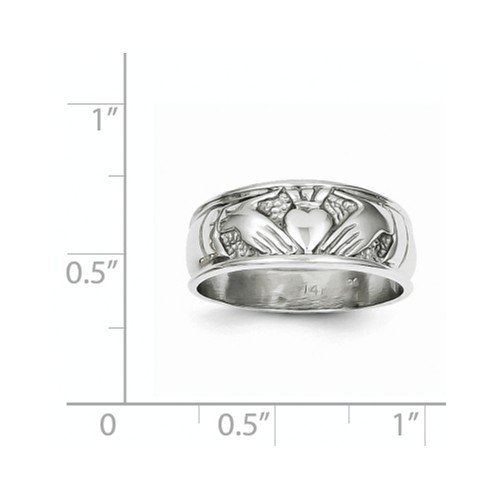 This ring is a 14k White Gold Polished Claddagh Ring and weighs 3.42 grams.