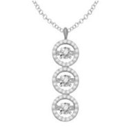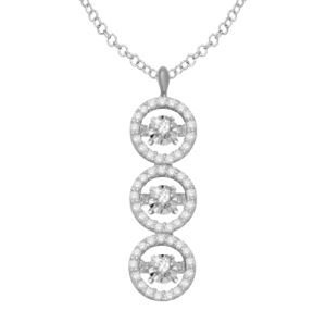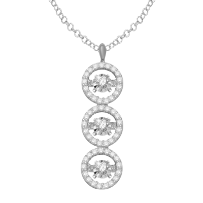 The center diamond is set into a small bezel that hugs the edge of the diamond. The bezeled diamond is then securely placed into the middle of the pendant using a new and innovated design allowing the diamond to continuously move with the slightest of movements such as breathing, heartbeat, or even the vibrations from the room you are standing in creating The Dancing Diamonds.