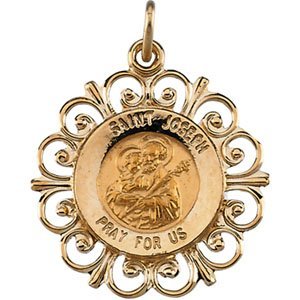 14K Yellow Gold Round Saint Joseph Religious Medal with Filigree Border