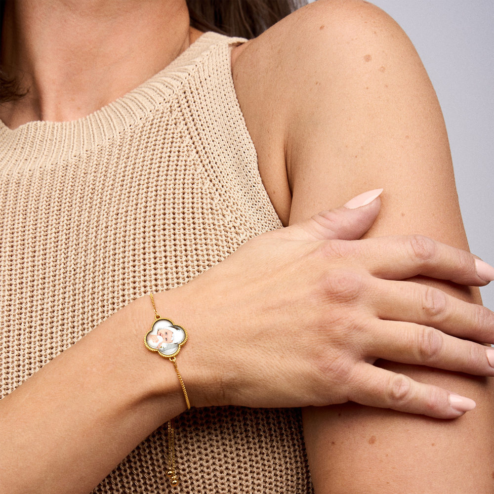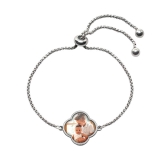 Carry your most meaningful moments with you in a unique and elegant way. This personalized bracelet features a clover-shaped photo charm, symbolizing love, luck, and cherished memories.
