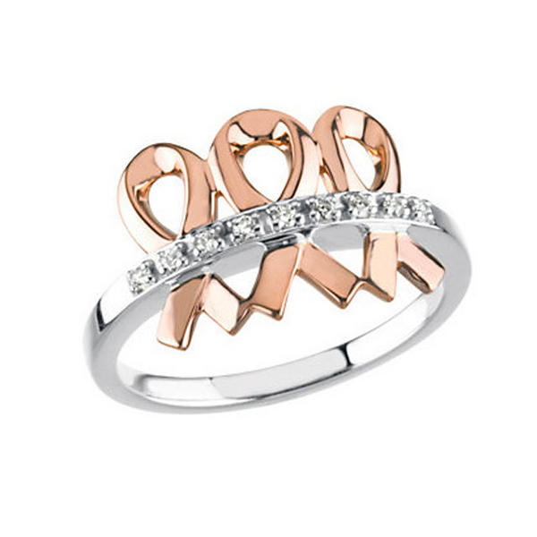 This High Polished White Gold Breast Cancer Awareness Band is Trimmed with 9 .13mm Diamonds, as well as 3 pink toned ribbons on the front side, set behind the band.