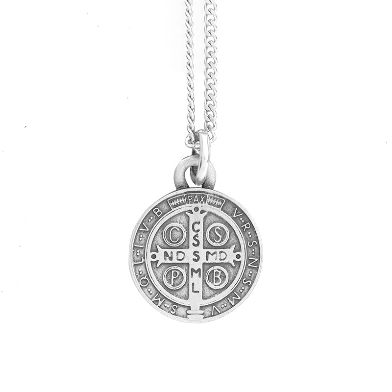 Antique Pewter Saint Benedict Medal w/ Continuous Curb Chain
