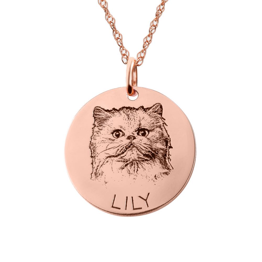 "I just recieved my order of two necklaces with my cat Gwenie's picture engraved in color and I can't begin to express how pleased I am with the attention to detail and care this company took to crop, center, and print her picture so perfectly on each necklace. My husband and I had to put our 19-yesr old cat down last week and these necklaces with her picture, mean so much to us. Thank you Pictures on Gold for creating such beautiful pieces of jewelry for us, we will cherish them forever."