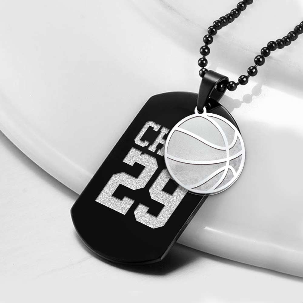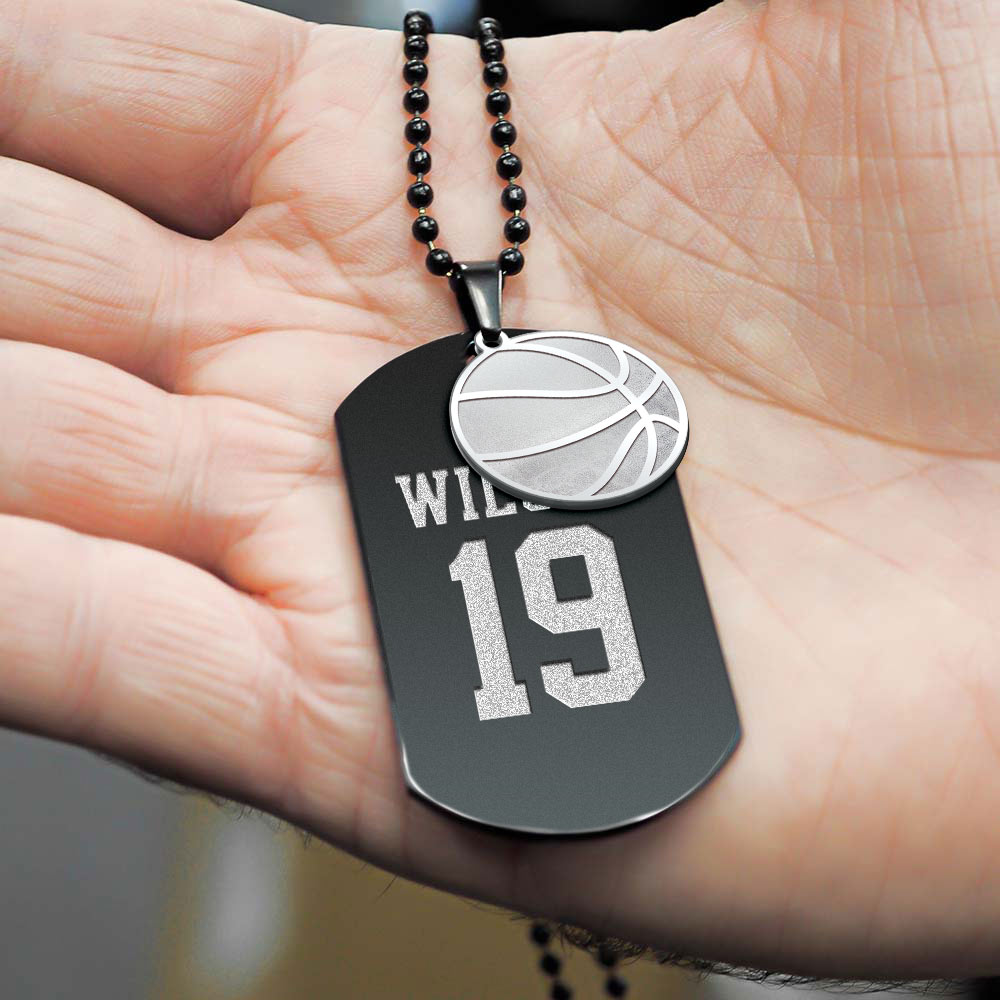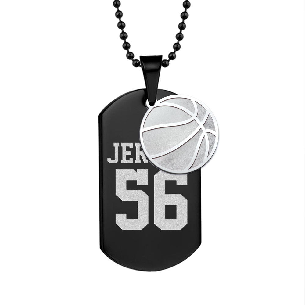 Welcome to the world of personalized fashion with this Black Stainless Steel Sports Name and Number Dog Tag with a Basketball Charm!