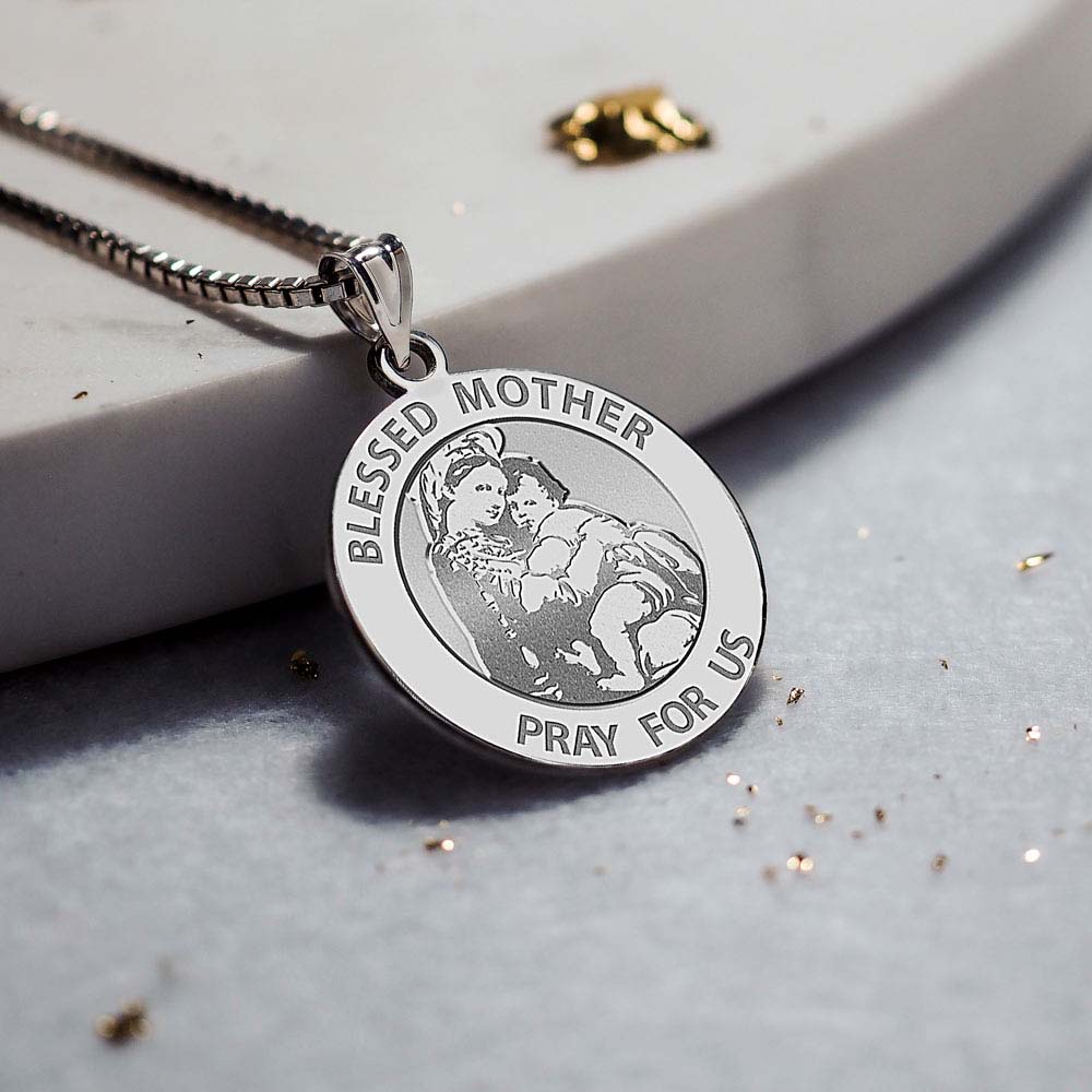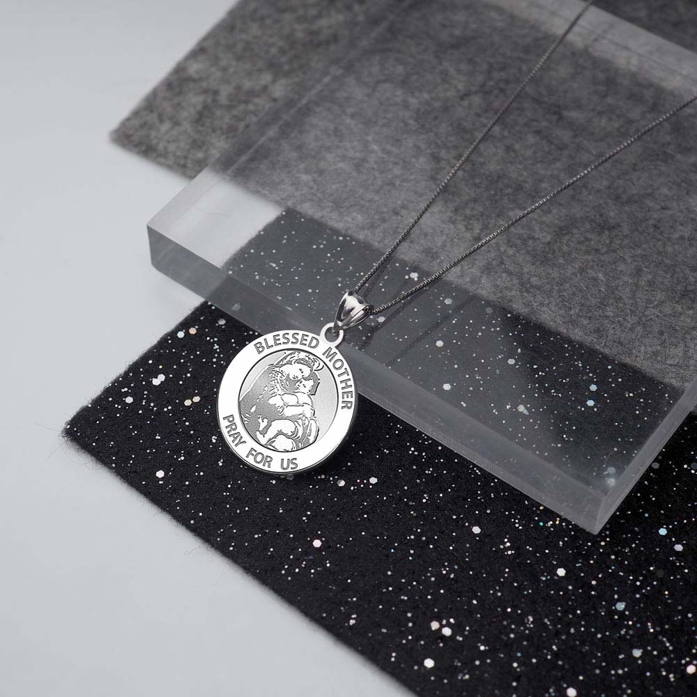 This Medal represents the Virgin Mary holding the baby Jesus. The engraved image is based on the Raphael Sanzio painting "Madonna of the Chair."