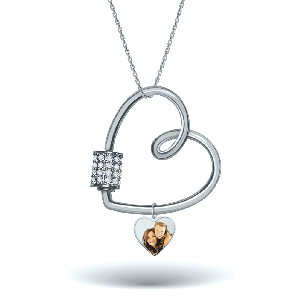 Carabiner Heart Pendant Necklace with CZ Barrel and Dangle Photo Charms / Chain Included