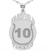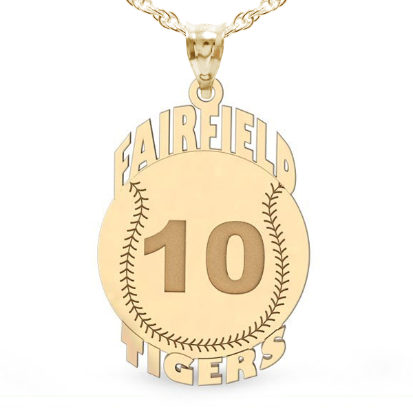 Your custom sports pendant is available in 2 sizes and in 14K Solid Yellow Gold, 14K Solid White Gold, Or Sterling Silver. Most can handle a name, team name, and even the number the players wear.