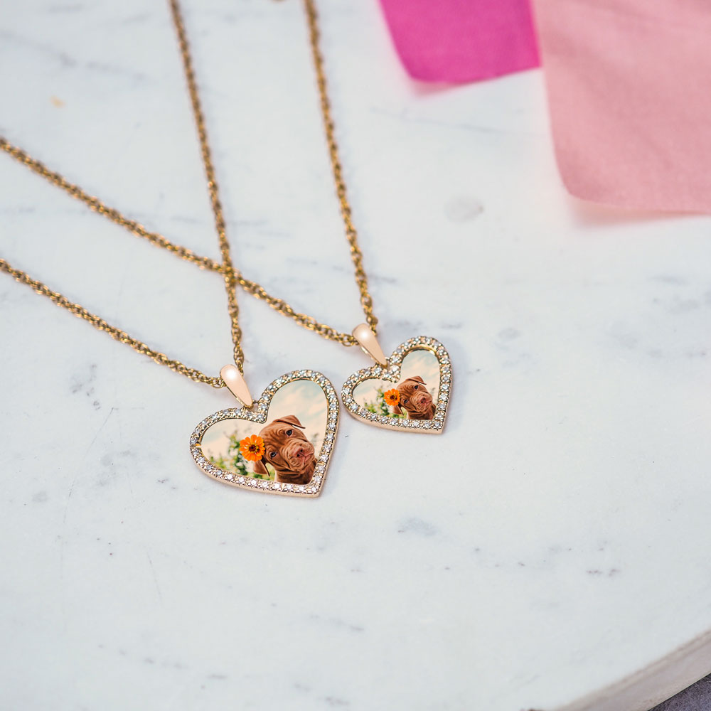 "I just recieved my order of two necklaces with my cat Gwenie's picture engraved in color and I can't begin to express how pleased I am with the attention to detail and care this company took to crop, center, and print her picture so perfectly on each necklace. My husband and I had to put our 19-yesr old cat down last week and these necklaces with her picture, mean so much to us. Thank you Pictures on Gold for creating such beautiful pieces of jewelry for us, we will cherish them forever."