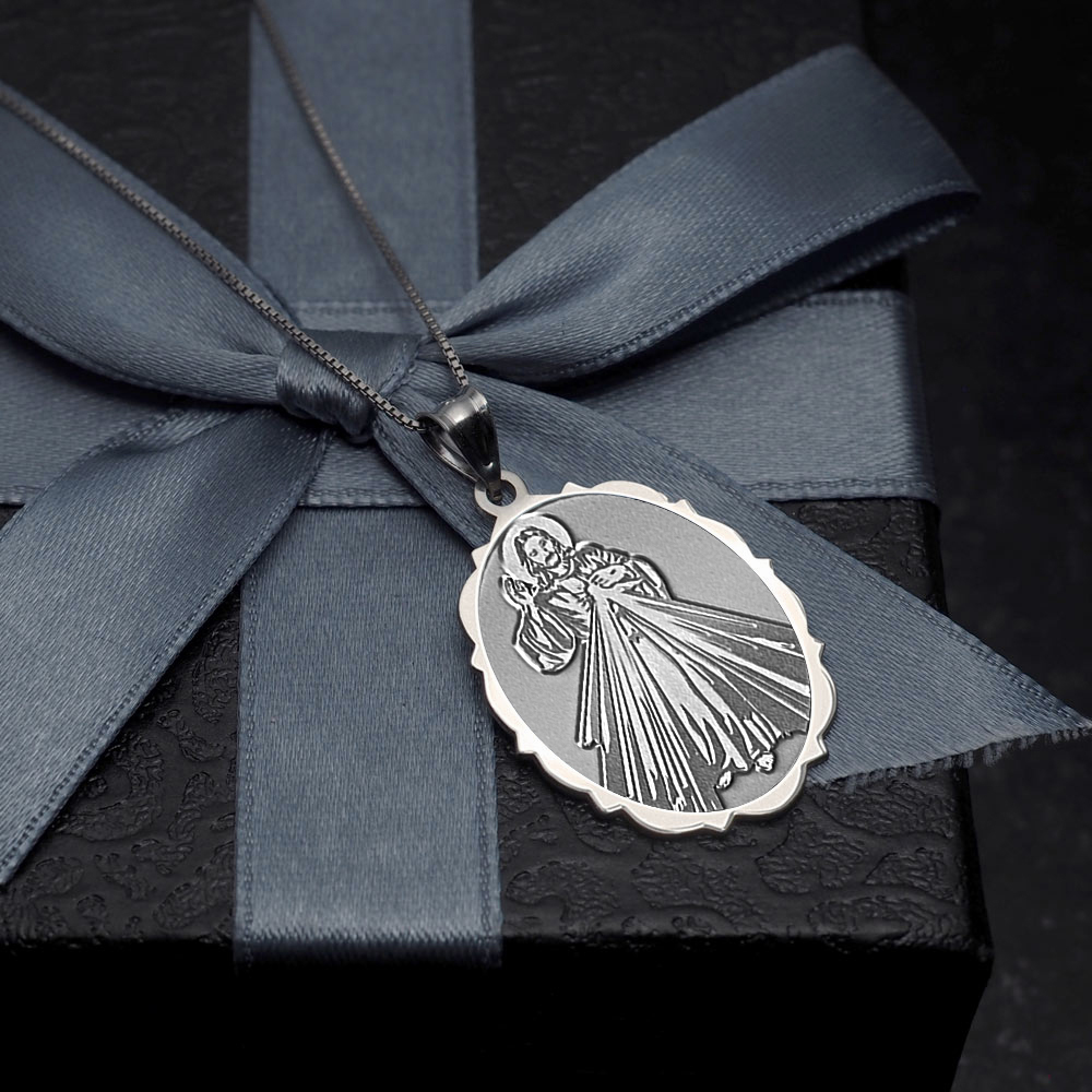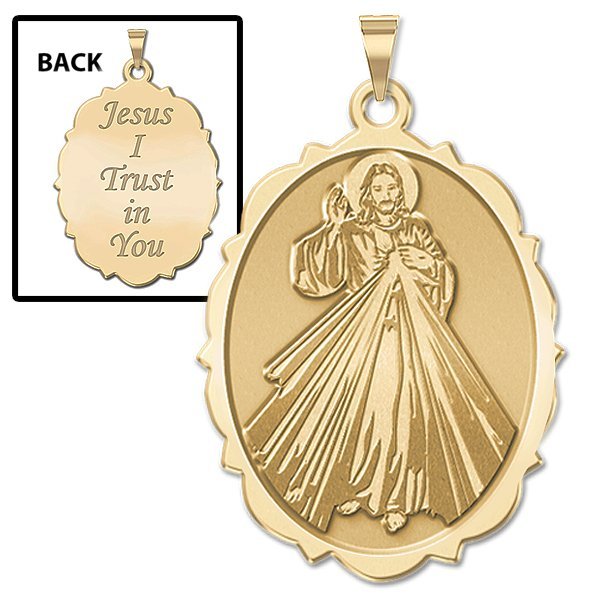 The front of the medal features the lord Jesus Christ and the back inscribes the words "Jesus I Trust In You." The Divine Mercy is a Christian devotion focused on the mercy of God and its power, particularly as a form of thanksgiving and entrusting of oneself to God's mercy. The devotion as known today can be traced to Polish nun and canonized saint, Sister Faustyna Kowalska, known as the "Apostle of Mercy", who lived from 1905-1938. It is known that anyone who seeks God's mercy will not be turned away (Matthew 7:7). "Jesus I Trust In You" are the words inscribed on a picture that Faustina had said was to be made at the request of Jesus himself through the inner speakings of the Lord to Faustina. In 2000, Pope John Paul II officially instituted the Feast of the Divine Mercy universally for the Catholic Church on the same day that he also canonized St. Faustina.