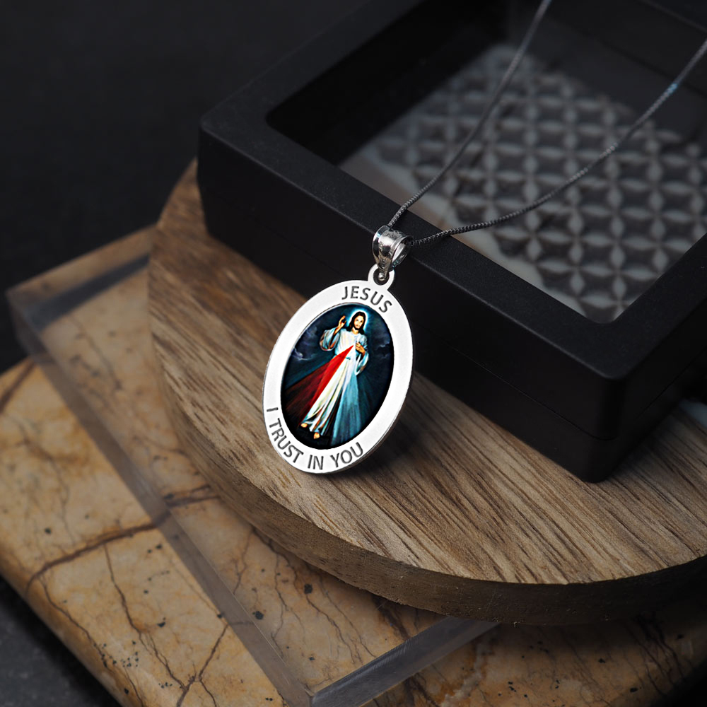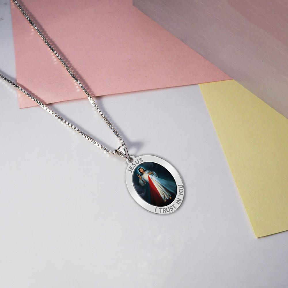 The front of the medal features the lord Jesus Christ and the back inscribes the words "Jesus I Trust In You."