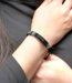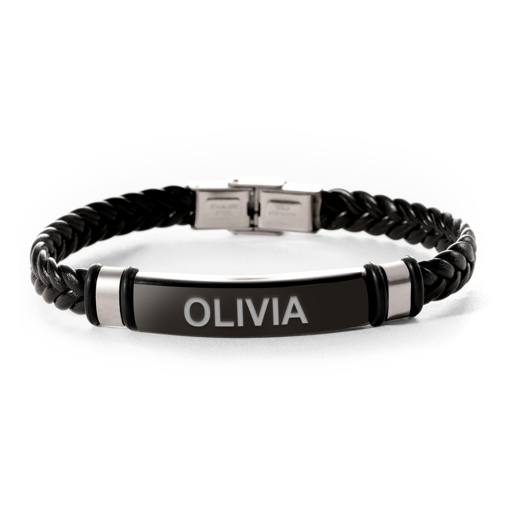 Engraved Black Stainless Steel ID Bracelet with Black Leather Rope Band