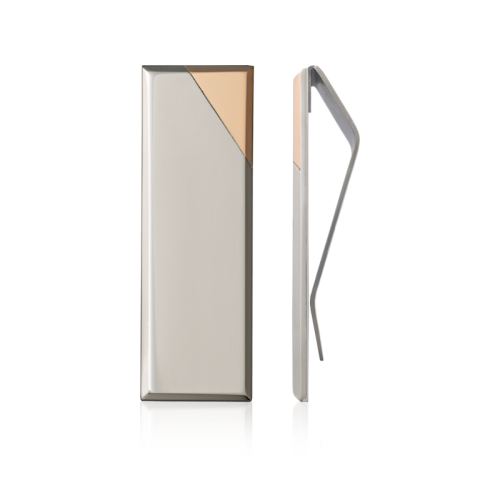 Iconic faceted money clip in polished and brushed stainless steel with cutaway corner design.