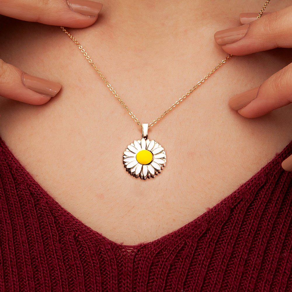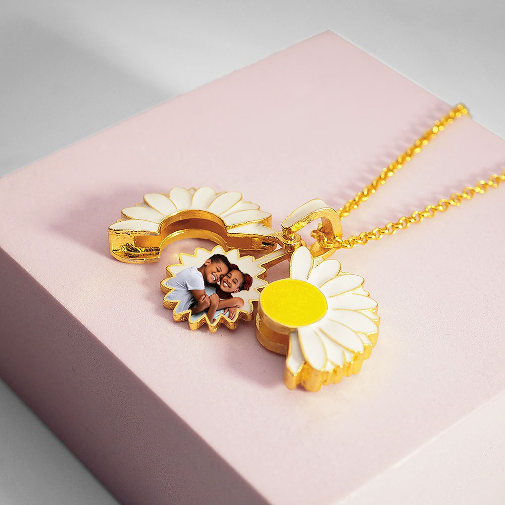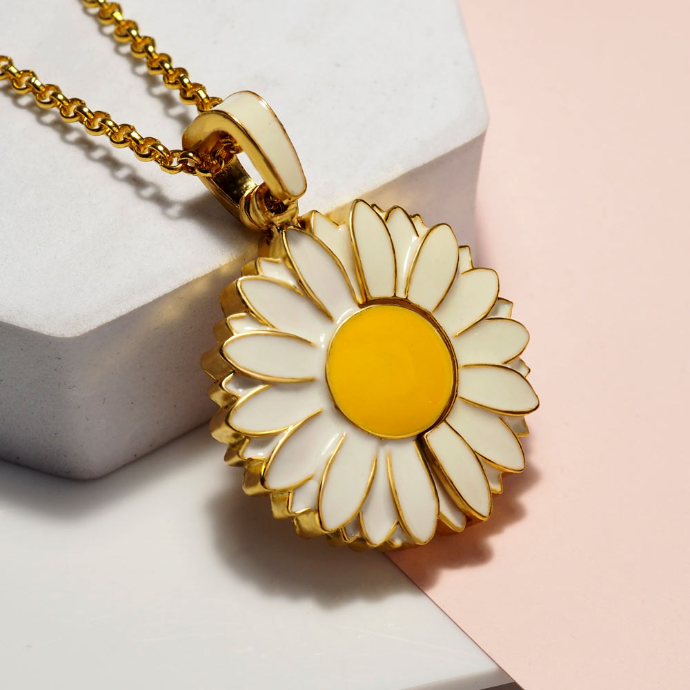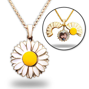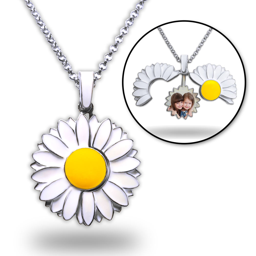 This beautiful Enameled Daisy Photo Necklace is the perfect gift for Mom, Sister, Aunt, or your Best Friend. This pendant closed shows off the vibrant colors of white and yellow of a Daisy on the front and back. When you open the Daisy, inside will appear a charm that can hold a photo and engraving.