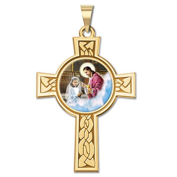 The Sacrament of the Body and Blood of Jesus. This medal celebrates receiving Jesus for the first time. This design is made specially for a girl receiving communion.