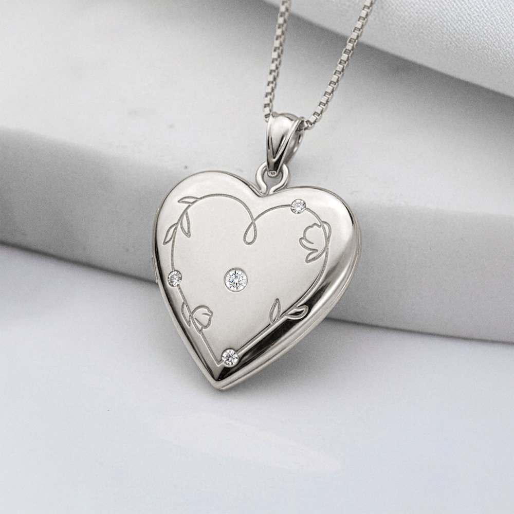 Floral Engraved Heart Locket with Diamond Accents