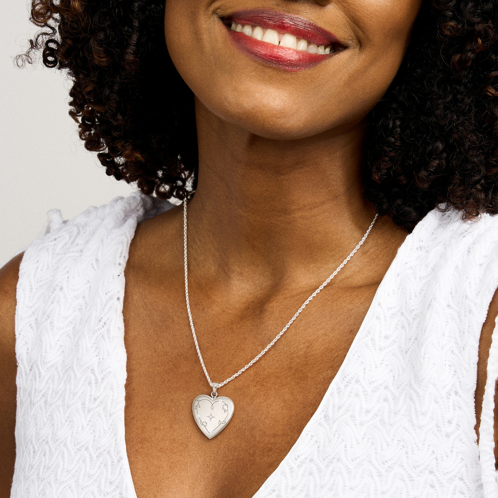 Keep your most meaningful memories close with this elegant Floral Engraved Heart Locket with Starburst Diamond. The timeless heart-shaped design features delicate floral engravings that create a romantic and classic look.