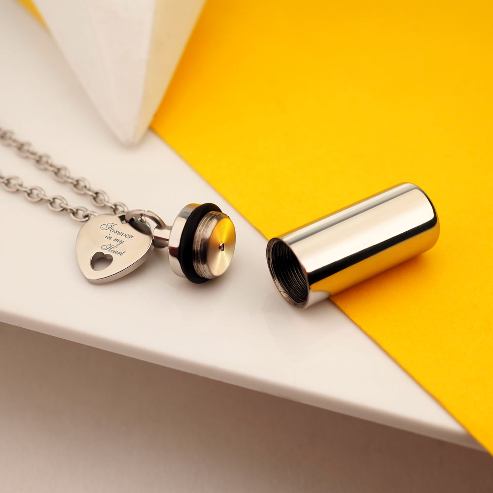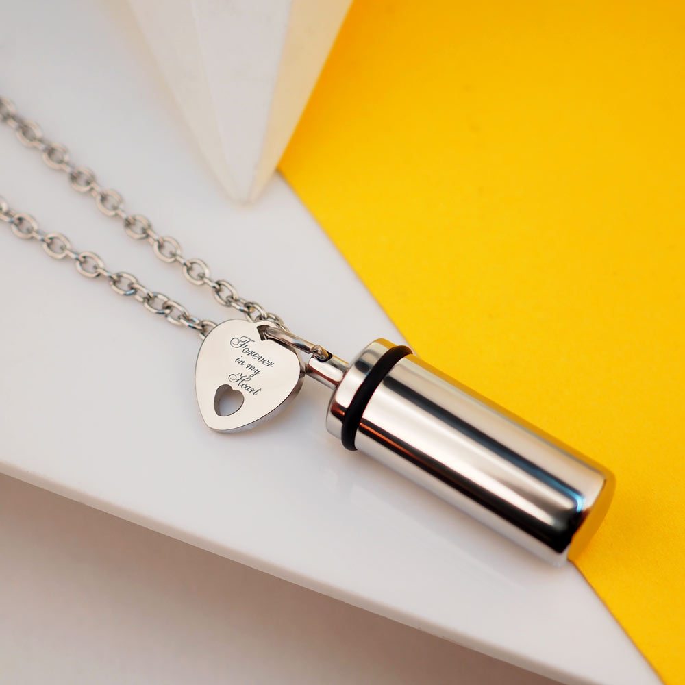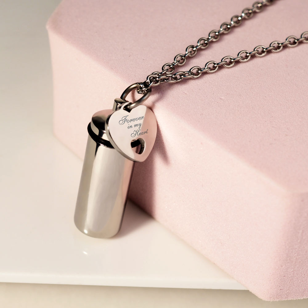 This Cremation Forever in my Heart Cylinder pendant is the perfect way to keep your loved one with you at all times.