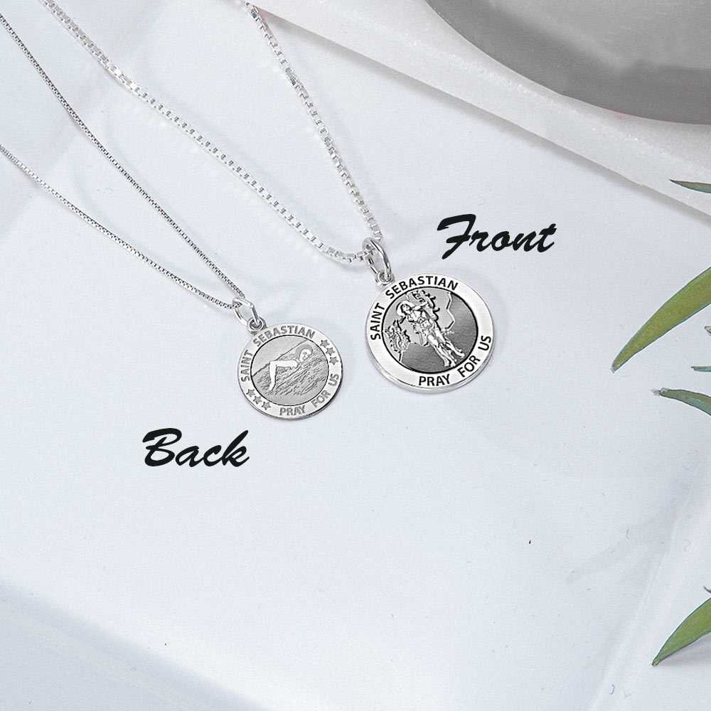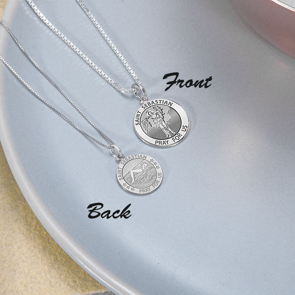 Saint Sebastian was a Christian saint and martyr, who is said to have been killed while the Roman emperor Diocletian engaged in the persecution of Christians in the 3rd century. He is commonly depicted in art and literature tied to a post and shot with arrows just like on this medal. He is patron saint to Soldiers, plagues, arrows, athletes and unofficially youth.