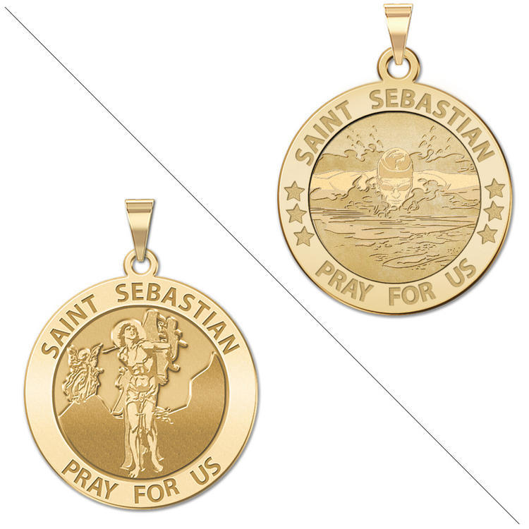 Saint Sebastian was a Christian saint and martyr, who is said to have been killed while the Roman emperor Diocletian engaged in the persecution of Christians in the 3rd century. He is commonly depicted in art and literature tied to a post and shot with arrows just like on this medal. He is patron saint to Soldiers, plagues, arrows, athletes and unofficially youth.