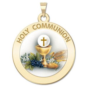 The Sacrament of the Body and Blood of Jesus. This 14K Solid Gold medal celebrates receiving Jesus for the first time. This design is made specially for a girl receiving communion.