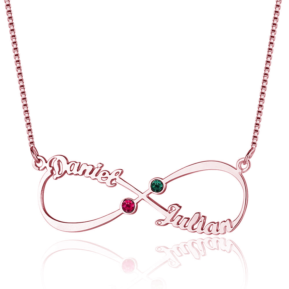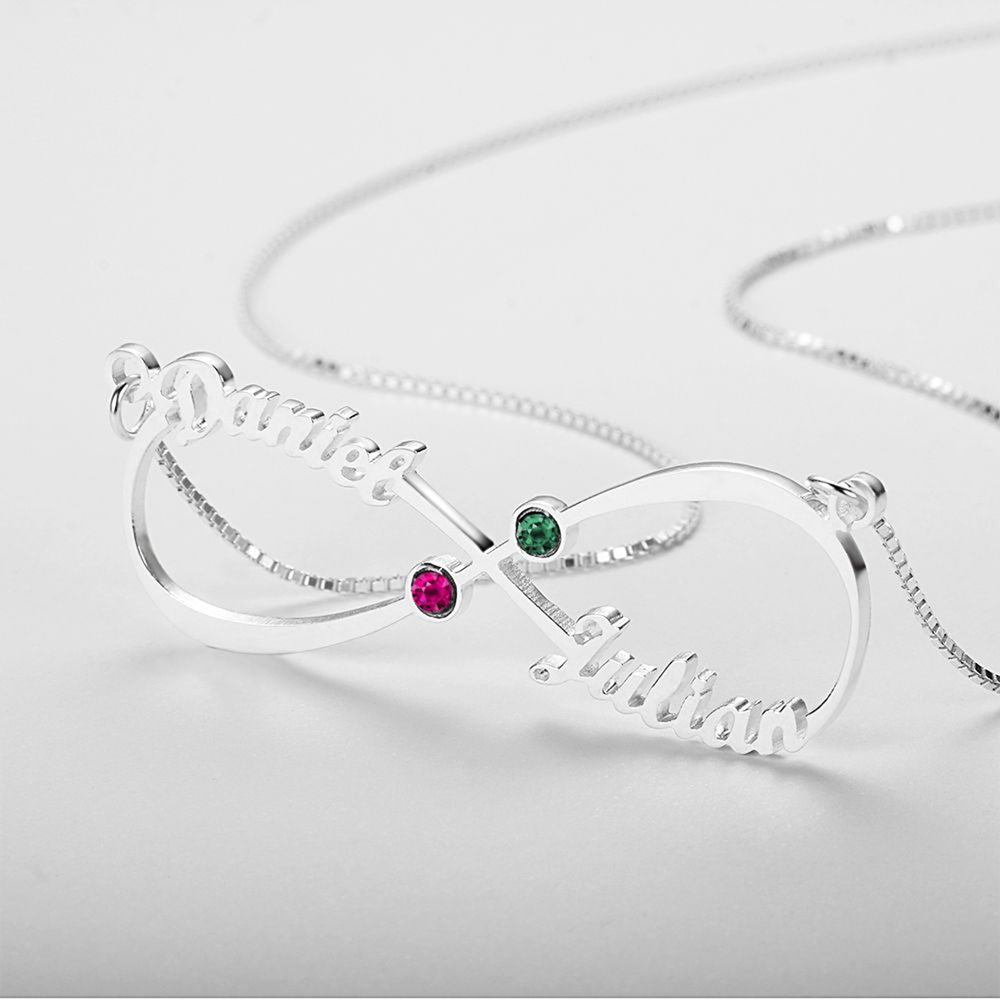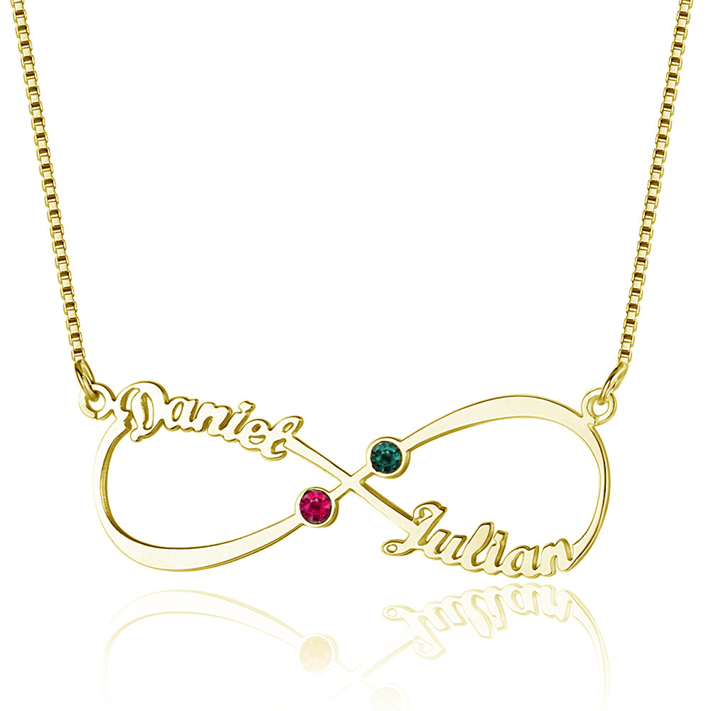 This Infinity Name Necklace w/ 2 Names & Birthstones is available in Solid .925 Sterling Silver, Solid 14k Yellow or White