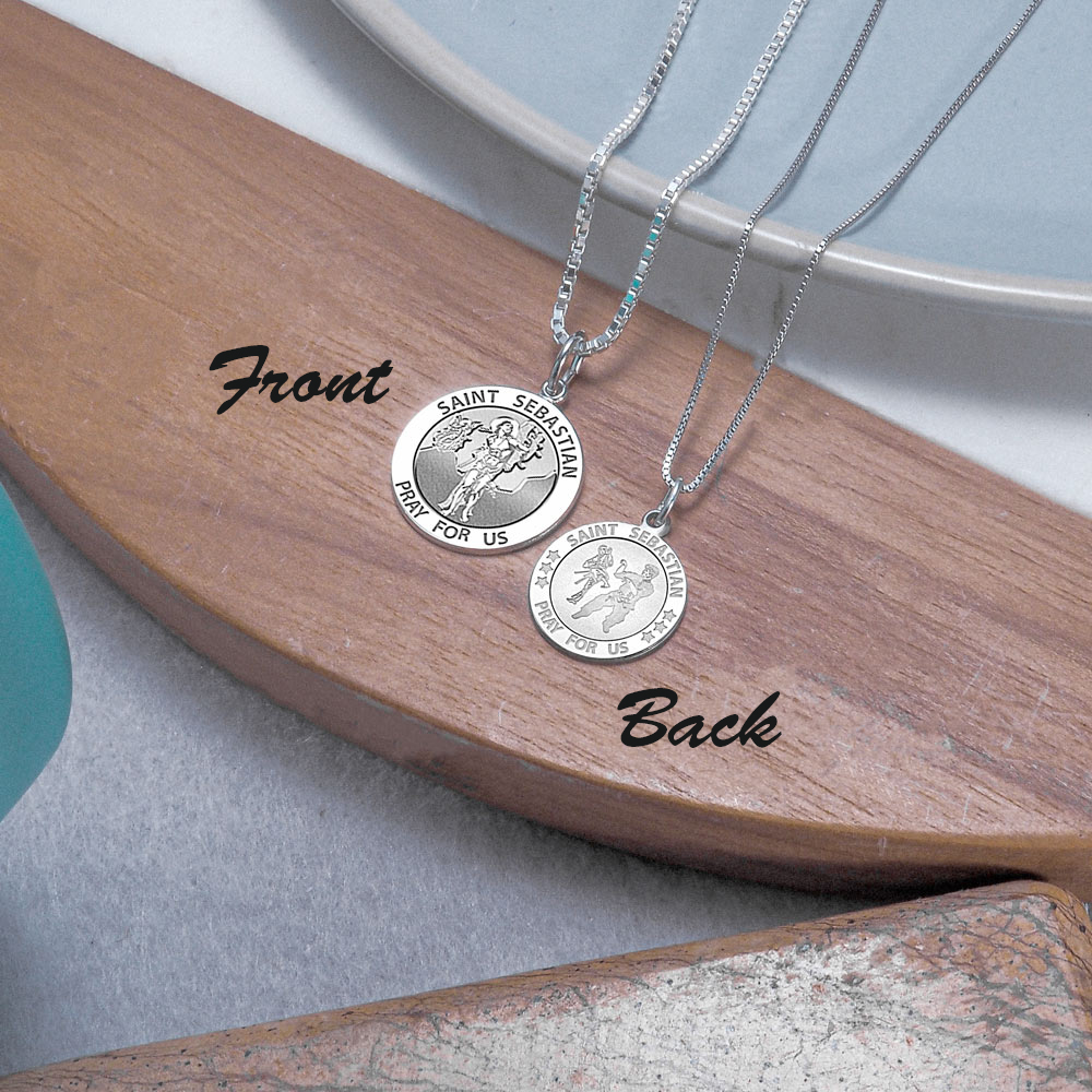 Saint Sebastian was a Christian saint and martyr, who is said to have been killed while the Roman emperor Diocletian engaged in the persecution of Christians in the 3rd century. He is commonly depicted in art and literature tied to a post and shot with arrows just like on this medal. He is patron saint to Soldiers, plagues, arrows, athletes and unofficially youth.