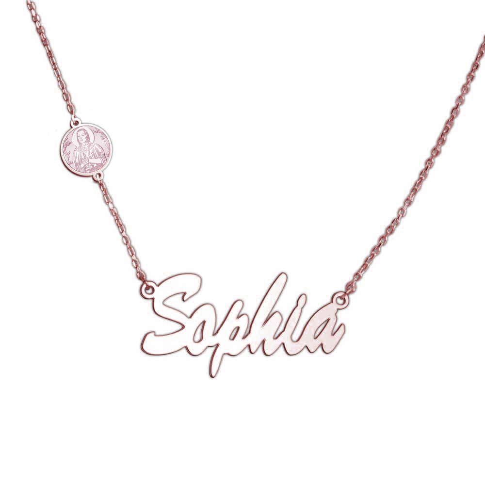 This Nameplate with Saint is an exclusive and unique item with Pictures On Gold. You can engrave the Back of the Saint charm attached to the chain! A Perfect gift to add their Confirmation Saint to their name. !