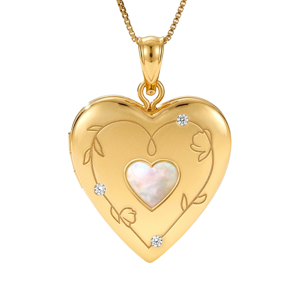Mother of Pearl Floral Engraved Heart Locket with Diamond Accents