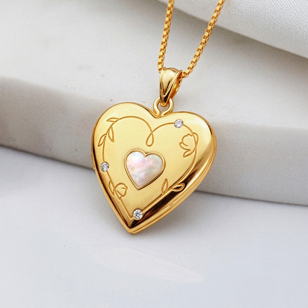 Celebrate meaningful moments with this elegant Mother of Pearl Floral Engraved Heart Locket with Diamond Accents. This timeless heart-shaped design features delicate floral engravings beautifully complemented by a luminous mother of pearl center, creating a soft and sophisticated look.